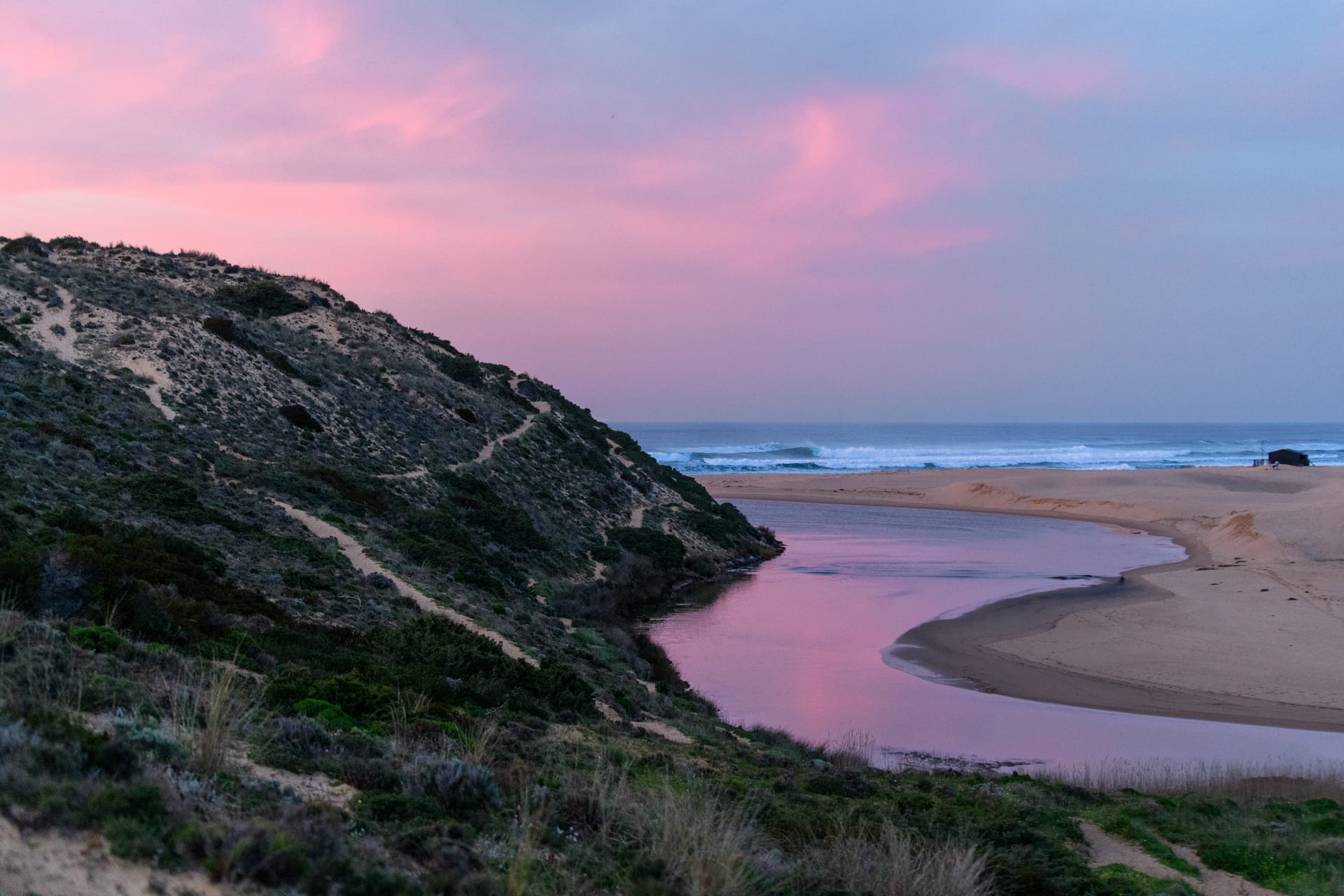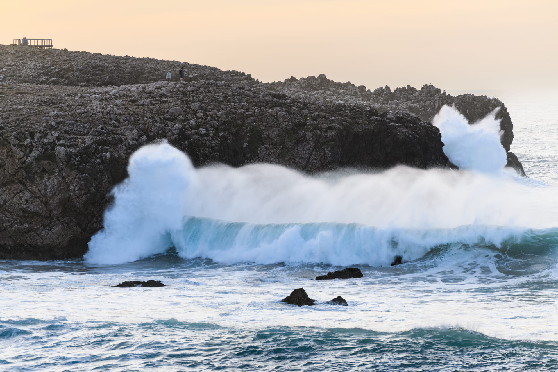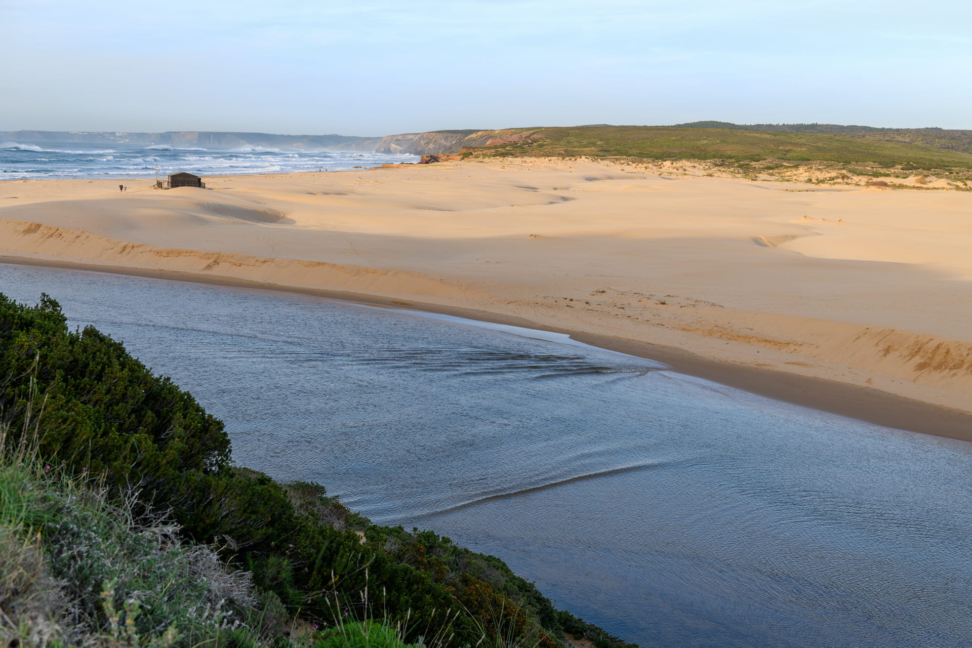 An der Westalgarve befindet sich inmitten einer großen Sanddünenlandschaft der Bordeira Strand. Bei Flut kann man den Wasserlauf aus dem Meer zurück in den Fluss Carrapateira beobachten und zur blauen Stunde spiegeln sich die rosaroten Wolken im Fluss. Ein Holzsteg führt mich zu einem Aussichtspunkt auf einen Felsen. Hier habe ich mit kürzerer Belichtungszeit die großen und schäumenden Wellen fotografiert, die an den Klippen umbrechen – ein faszinierendes Naturschauspiel.