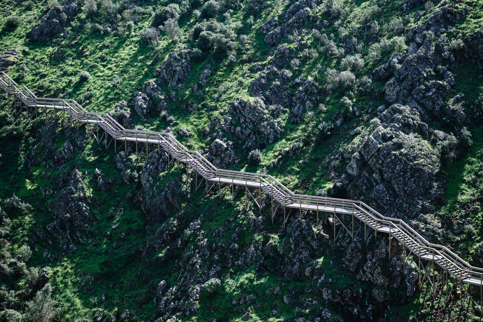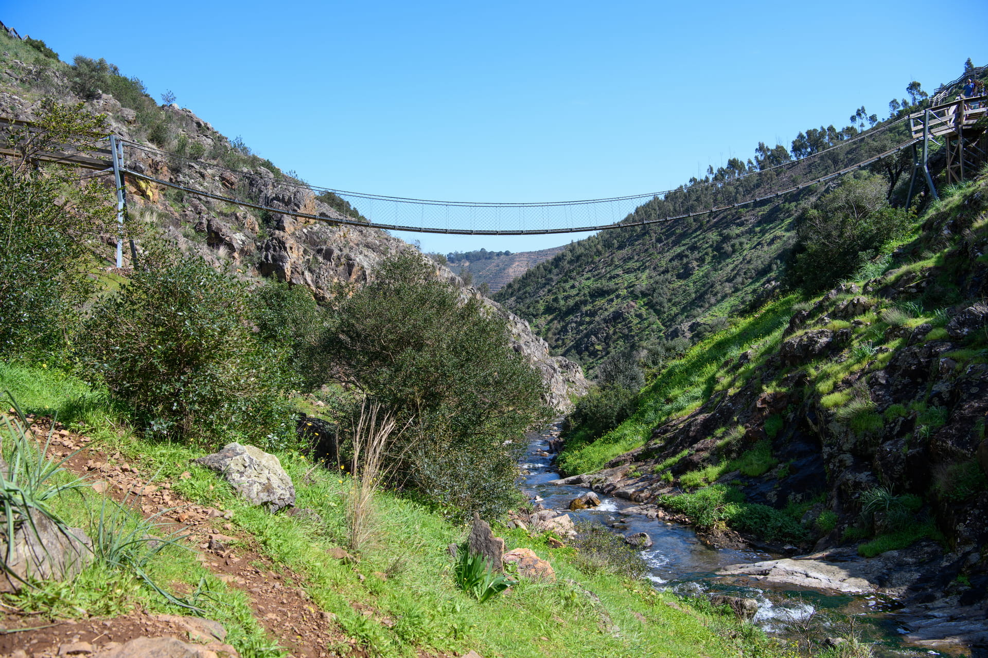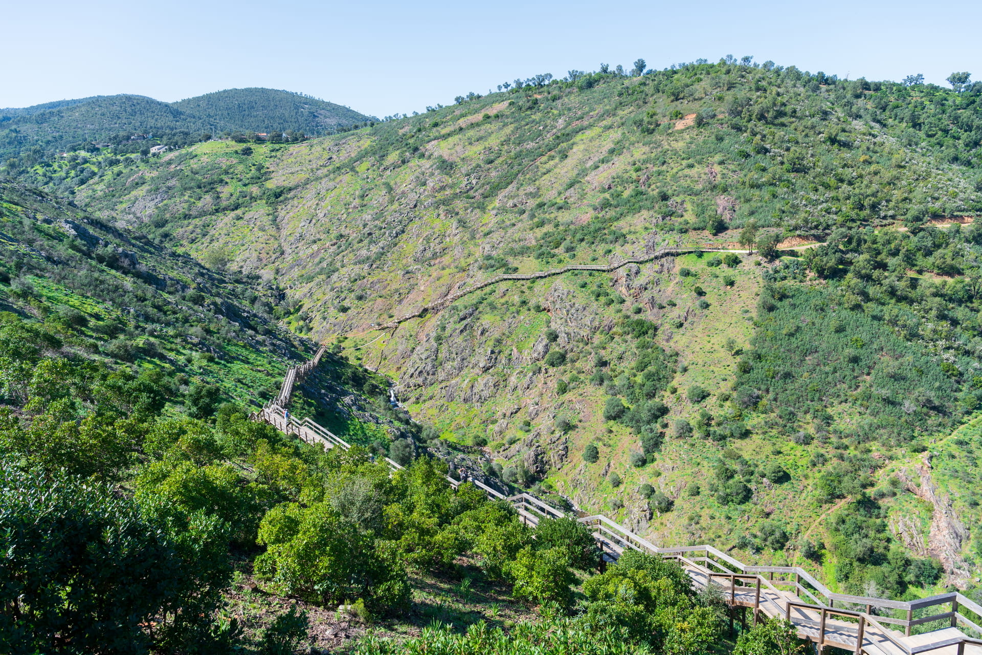 Neben der vielseitigen Küstenlandschaft hat das Hinterland der Algarve auch einiges zu bieten. Der erst 2023 neu erbaute Wanderweg aus Holz bei Alferce „Passadico do Barranco do Demo“ führt als Rundweg über eine Schlucht vorbei an Eukalyptusbäumen. Zwischen den Bergen ist eine ca. 50 m lange Hängebrücke über einen Fluss gespannt. Hier musste ich mich etwas überwinden, um zur anderen Seite zu kommen. Nach mehreren Treppenstufen am Berg konnte ich dann die großartige Aussicht auf das Tal bei Monchique genießen.