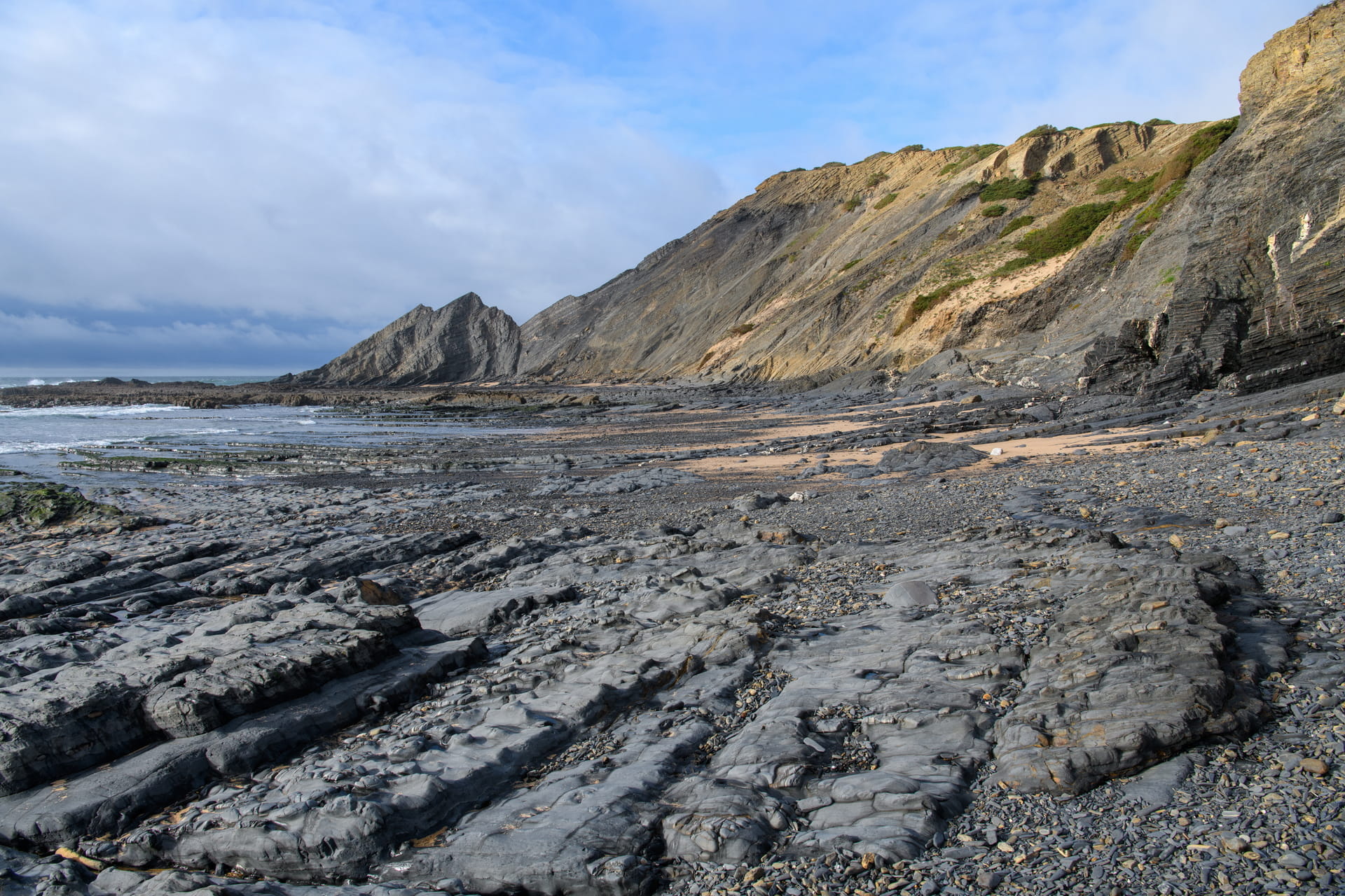 Meine letzte spannende Fotolocation war wieder eine Küstenlandschaft bei Aljezur - der Naturstrand „Amoreira“ mit meterhohen Dünen, Lagunen und einer versteinerten Düne vor einer Felswand aus schwarzem Schiefer. Das tief stehende Sonnenlicht brachte die Kontraste des dunklen Gesteins und die Struktur wunderbar zur Geltung. Ich wählte tiefe Foto-Standpunkte für mehr Dramatik im Bild 📷.