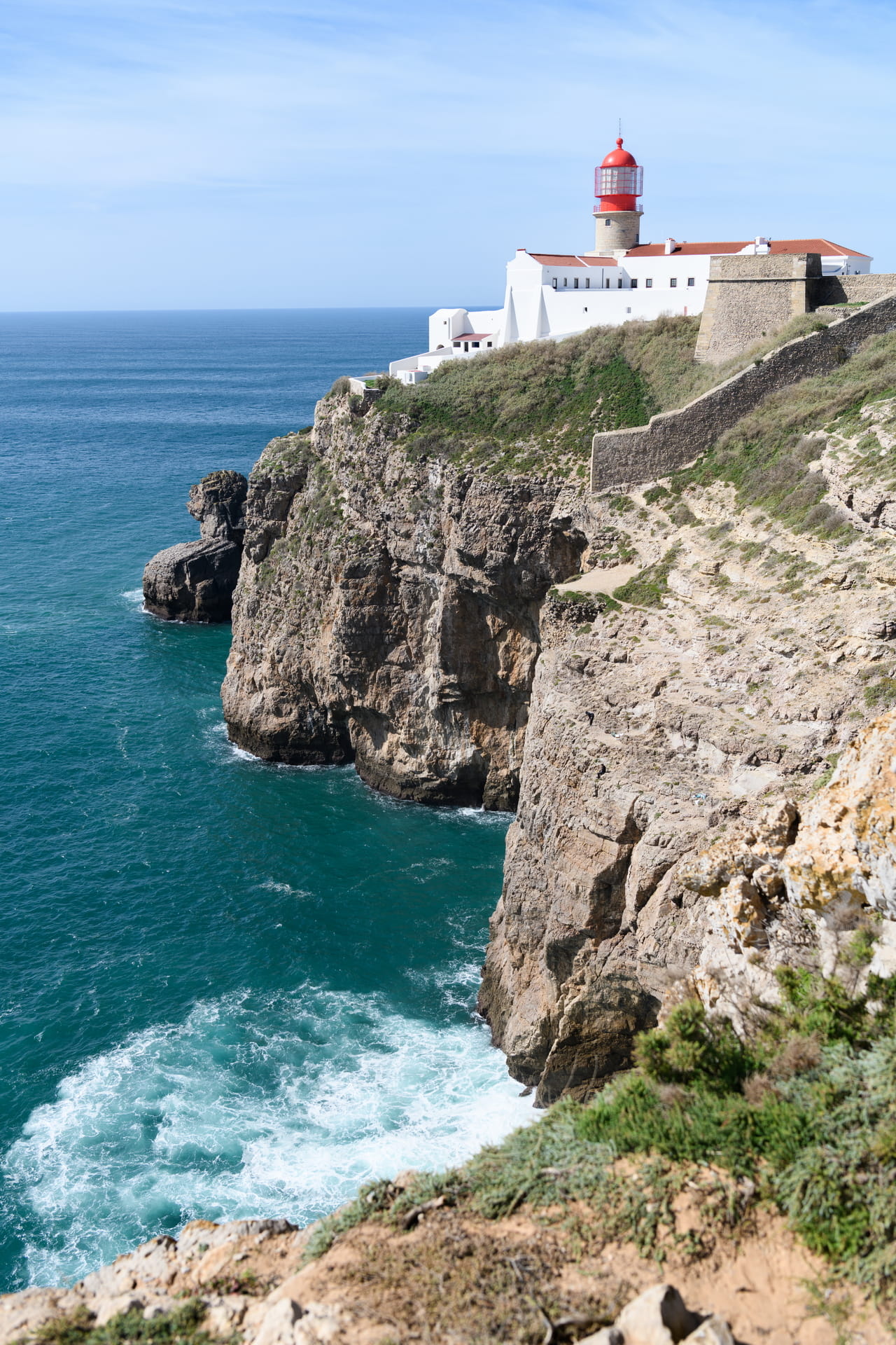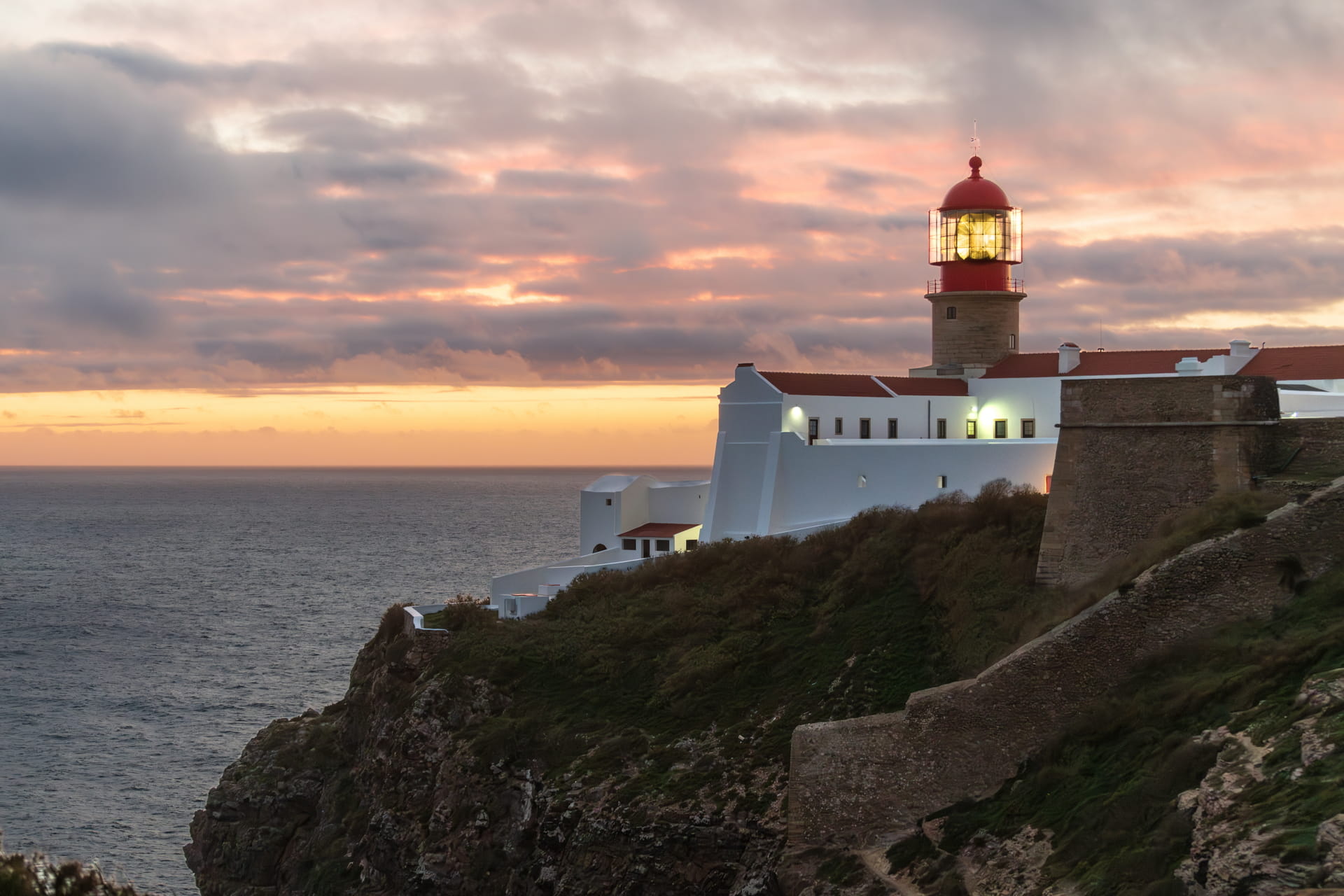 Mit dem Fahrrad und meinem Fotorucksack strampelte ich auf einem Radweg zum südwestlichsten Punkt des europäischen Festlands, dem Kap Sankt Vinzenz. Hier auf der Landspitze thront der 22 m hohe Leuchtturm über dem Meer. Man muss beim Fotografieren besonders auf den steilen Klippen vorsichtig sein, da es hier keine Absperrungen gibt. Umso weniger konnte ich zwei Männer verstehen, die mitten auf dem rutschigen Felsen geangelt haben. Ich fragte mich, wie sie den Fisch, wenn er dann anbeißt, aus dem Wasser ziehen. Wer mein Foto vergrößert, findet vielleicht die Waghalsigen mittig rechts im Foto. Na entdeckt? Da mir der weiße Leuchtturm so gut gefallen hat, war ich noch einmal kurz nach dem Sonnenuntergang hier. Jetzt überwiegen die roten und gelben Farben und verbreiten eine romantische Stimmung.