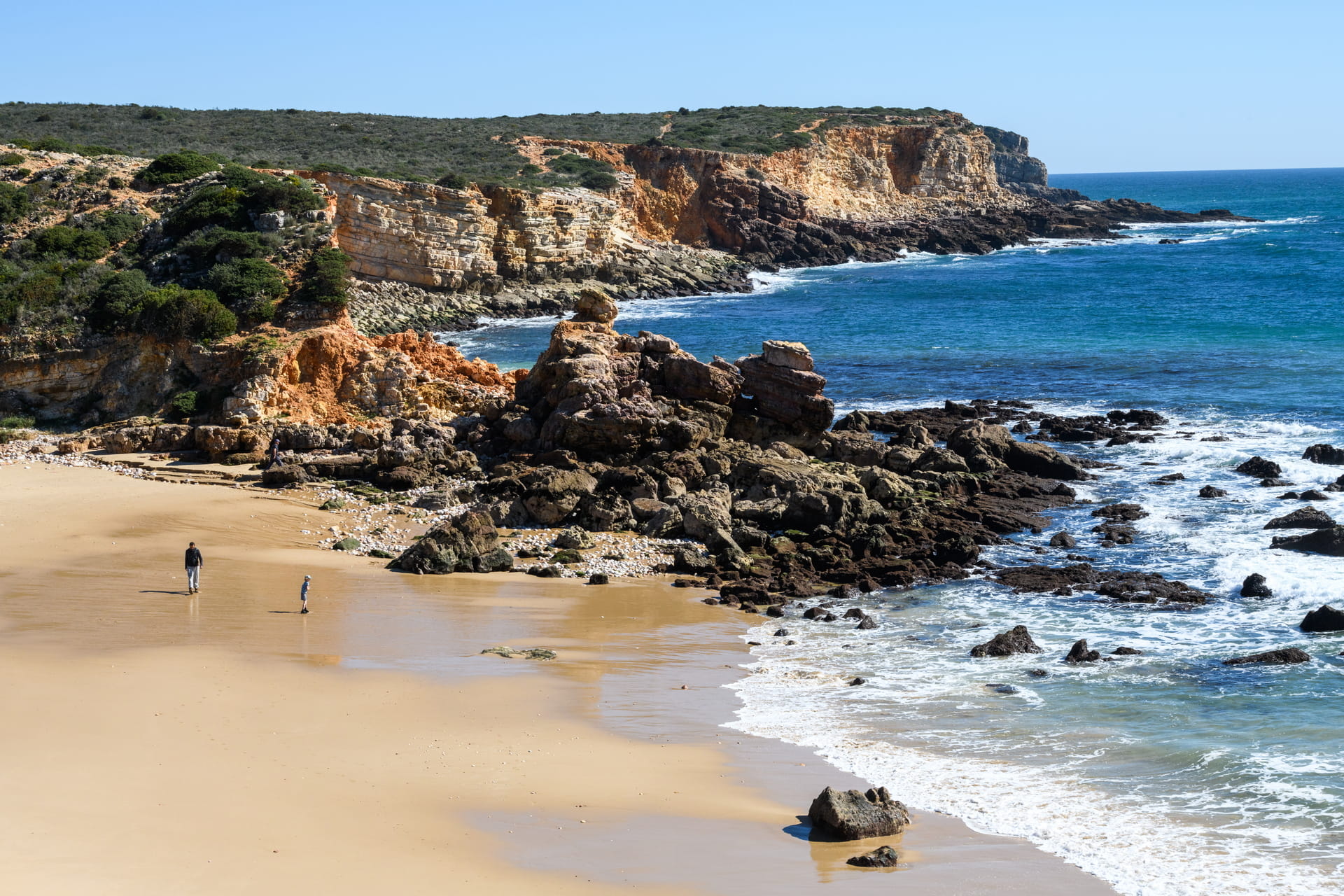 Gleich neben unserem Hotel Memmo Baleeira in Sagres am südlichsten Zipfel Portugals, konnte ich entspannt am Wasser entlang von einem Strand zum nächsten spazieren. Dann wechselte ich die Perspektive. Von oben auf den Felsen blickte ich durch meinen Sucher direkt auf den leeren Sandstrand und das türkisfarbene Wasser.