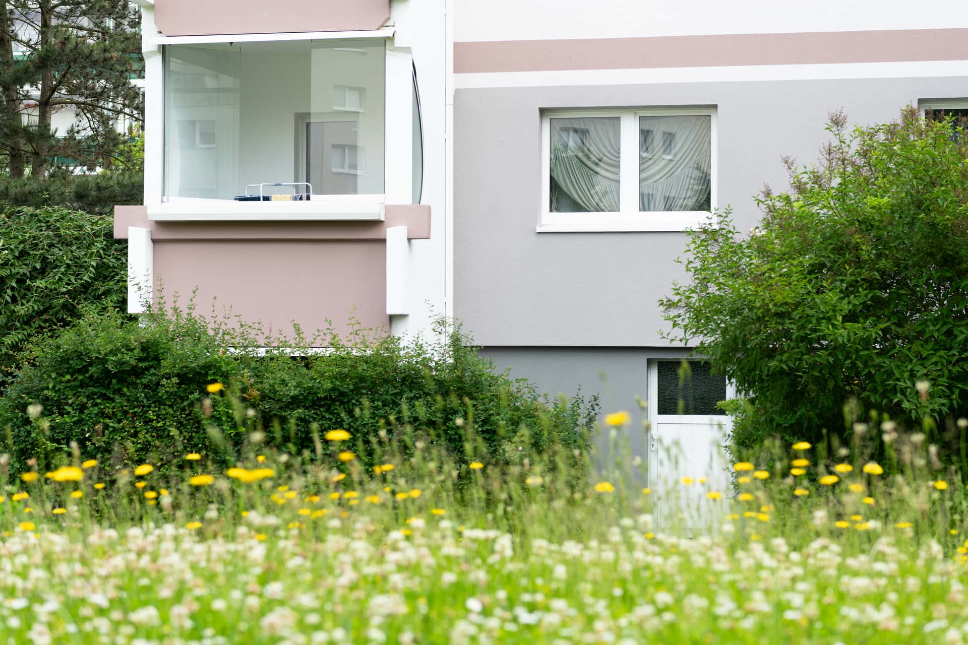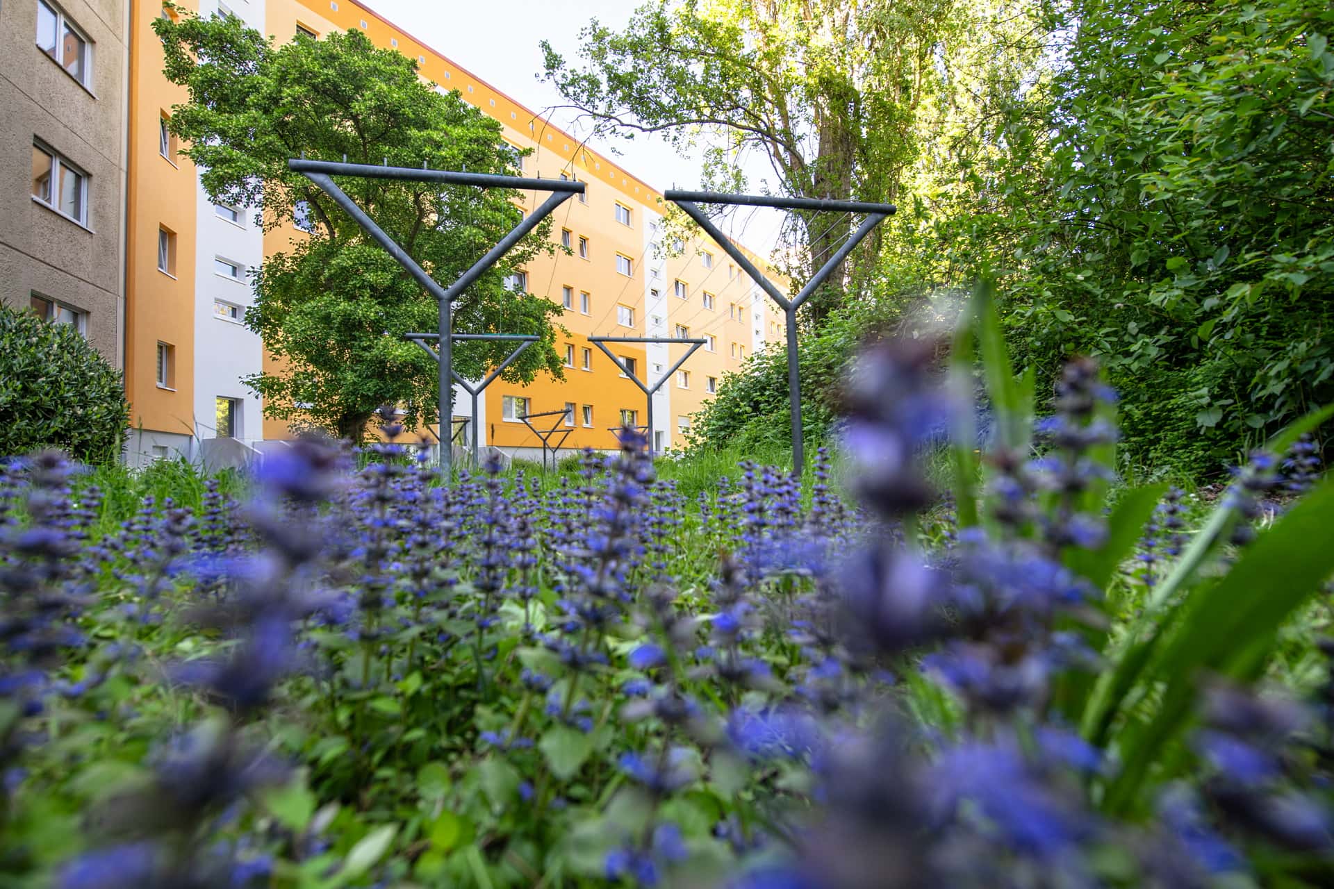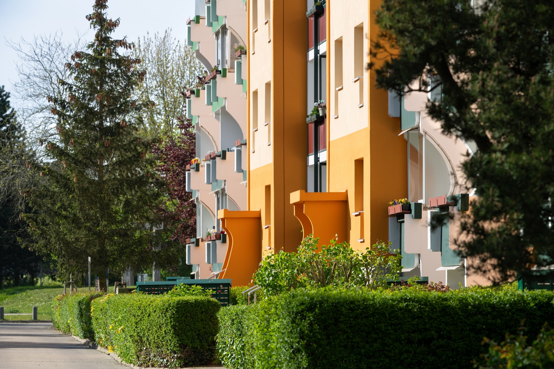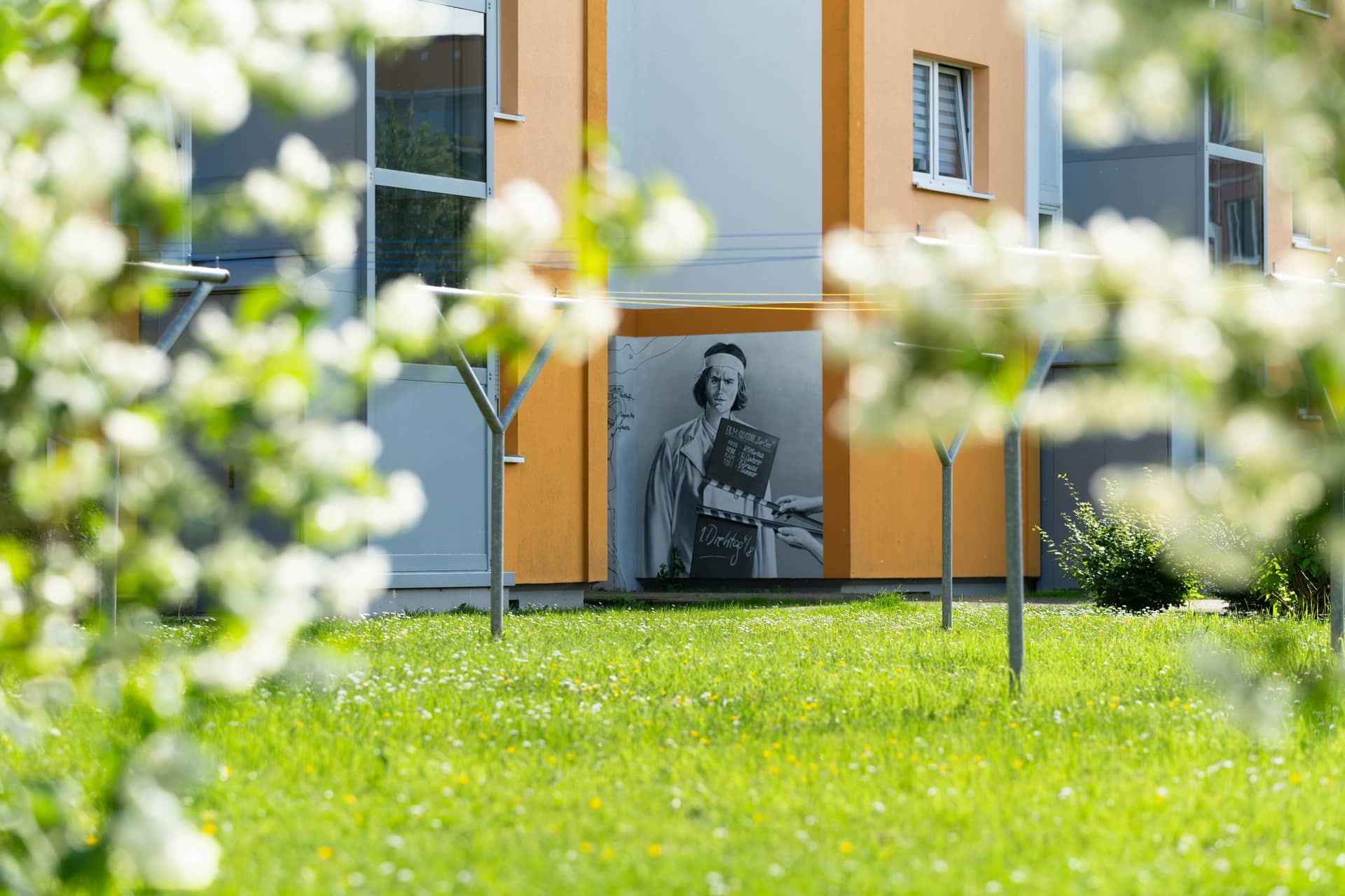 Die Häuser sind fröhlich bunt angestrichen, haben teilweise moderne Außenaufzüge aus Glas und die Durchgänge zum Innenhof sind von Graffitikünstlern naturgetreu gestaltet. Was mich besonders beeindruckt hat, waren die gepflegten Grünflächen rund um die Häuser. Diese Wohlfühlatmosphäre wollte ich unbedingt den zukünftigen Mieter:innen zeigen.