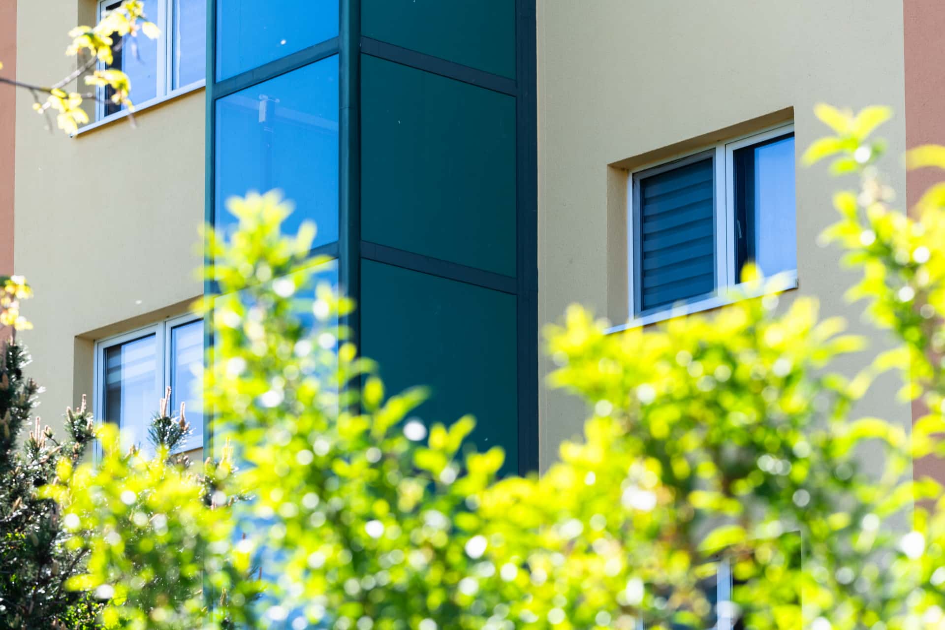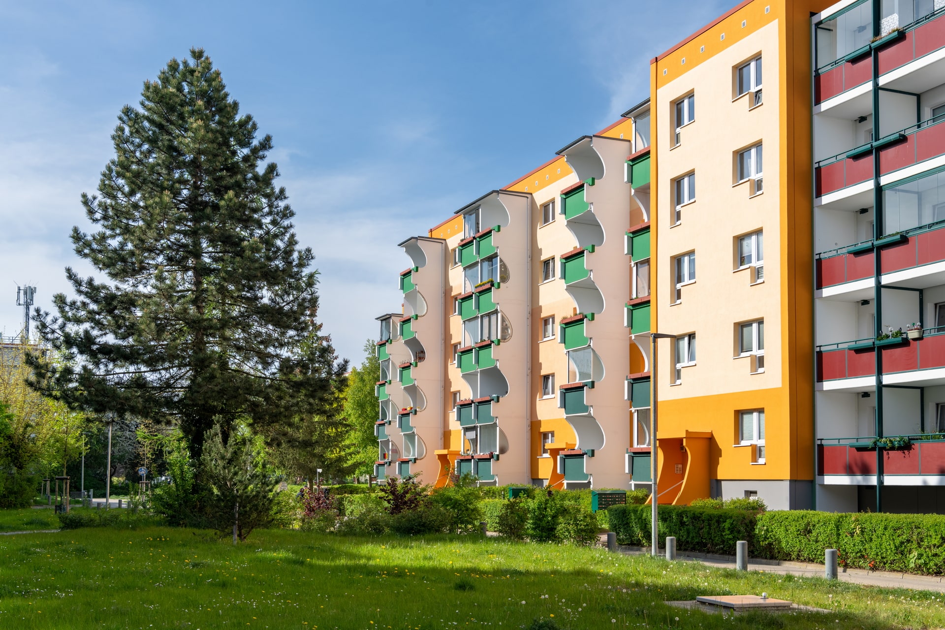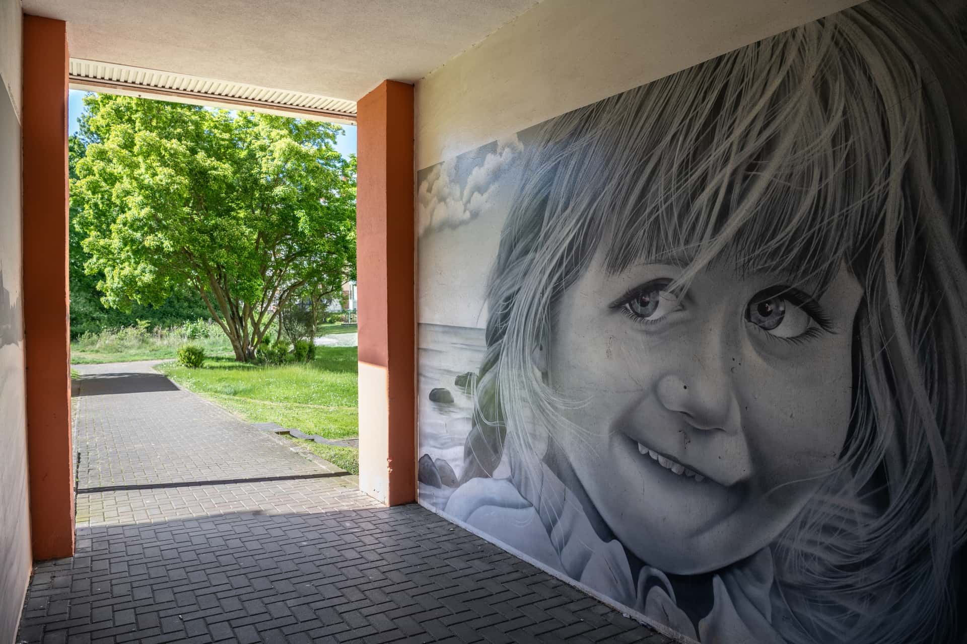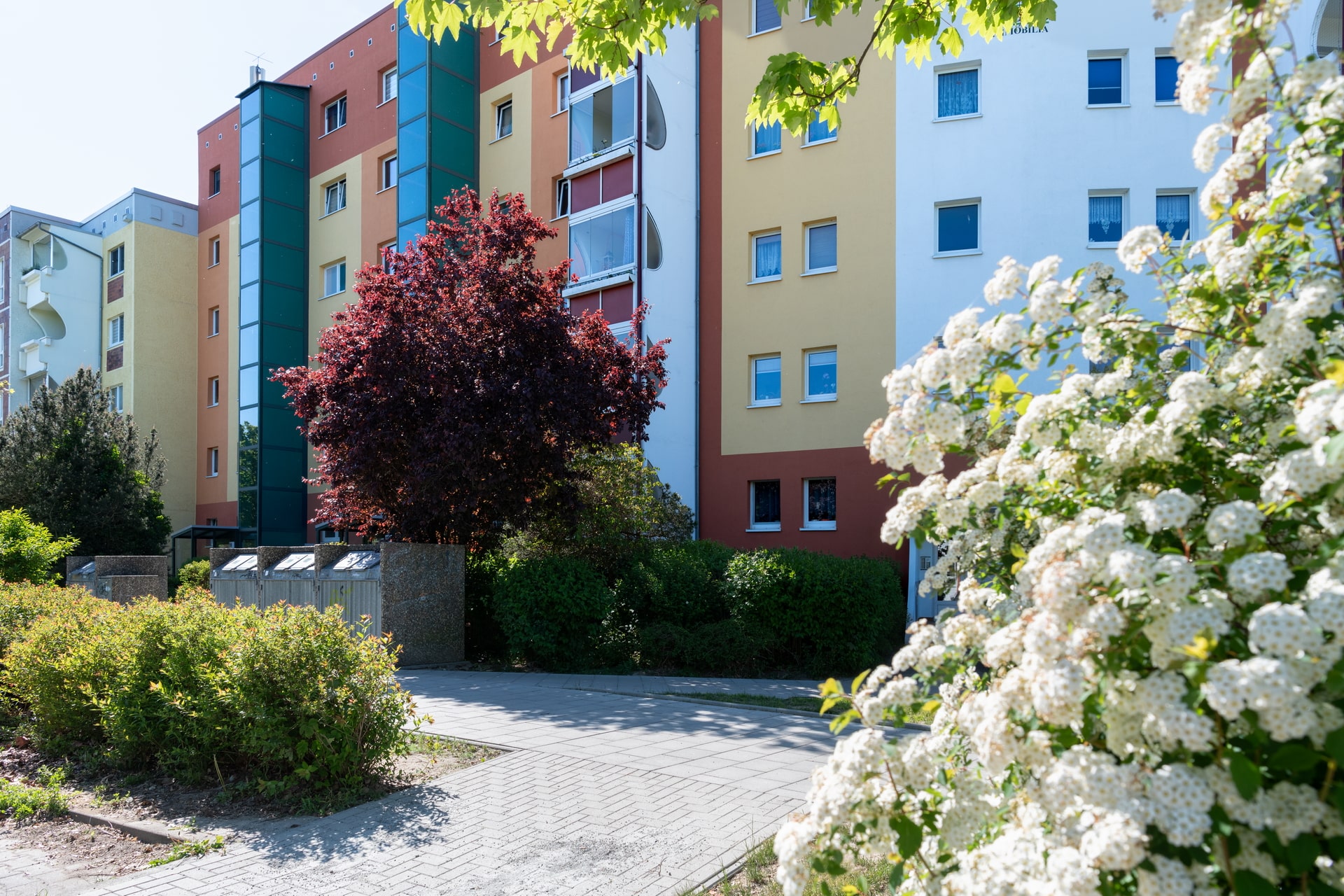 Die Häuser sind fröhlich bunt angestrichen, haben teilweise moderne Außenaufzüge aus Glas und die Durchgänge zum Innenhof sind von Graffitikünstlern naturgetreu gestaltet. Was mich besonders beeindruckt hat, waren die gepflegten Grünflächen rund um die Häuser. Diese Wohlfühlatmosphäre wollte ich unbedingt den zukünftigen Mieter:innen zeigen.